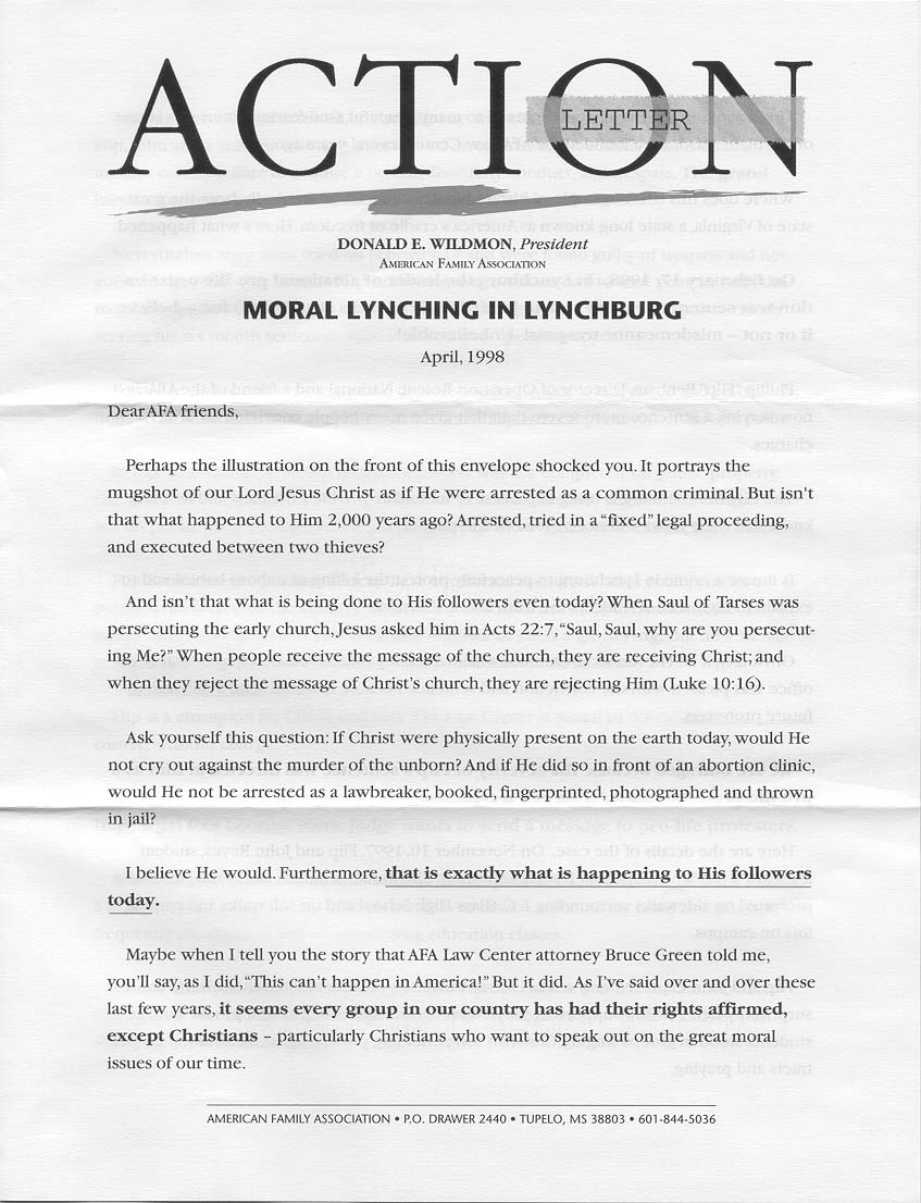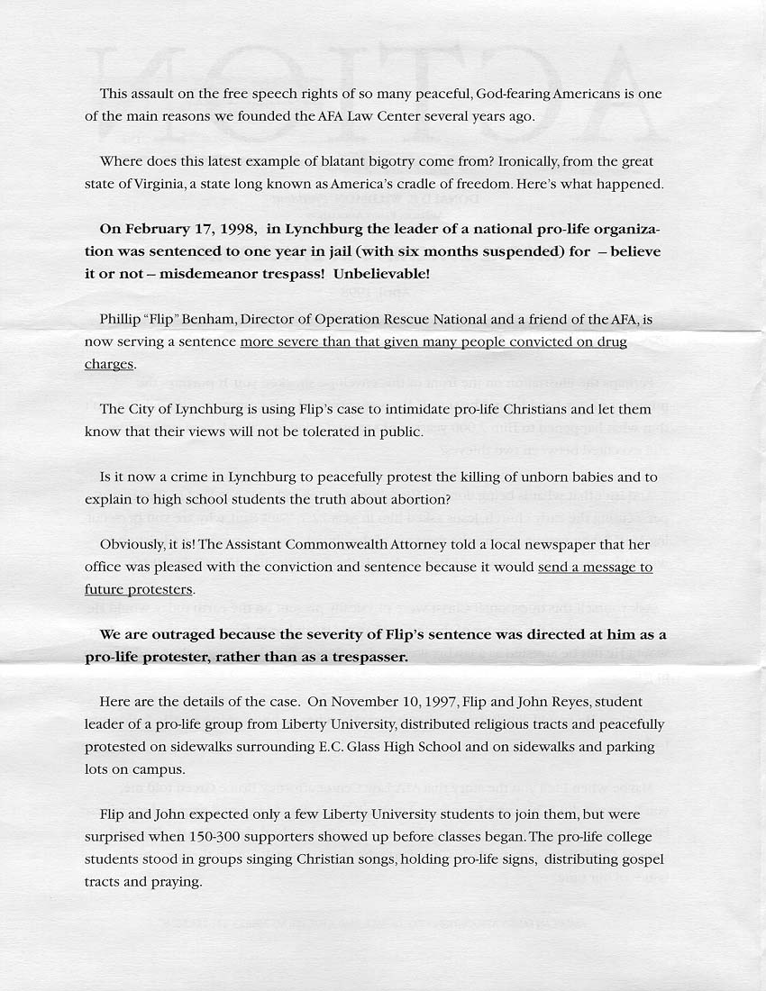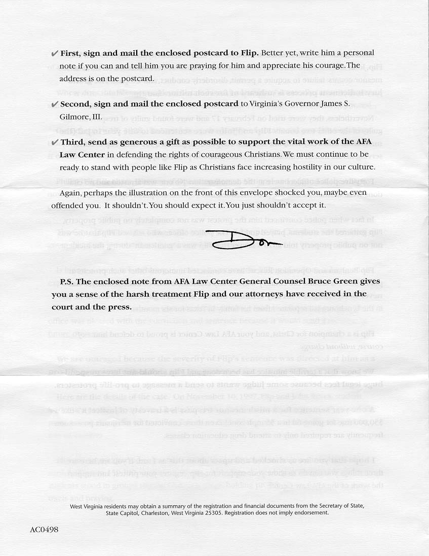 P.S. The enclosed note from AFA Law Center General Counsel Bruce Green gives you a sense of the harsh treatment Flip and our attorneys have received in the court and the press.