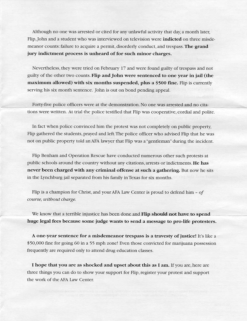 Flip Benham and Operation Rescue have conducted numerous other such protests at public schools around the country without any citations, arrests or indictments. He has never been charged with any criminal offense at such a gathering. But now he sits in the Lynchburg jail separated from his family in Texas for six months.