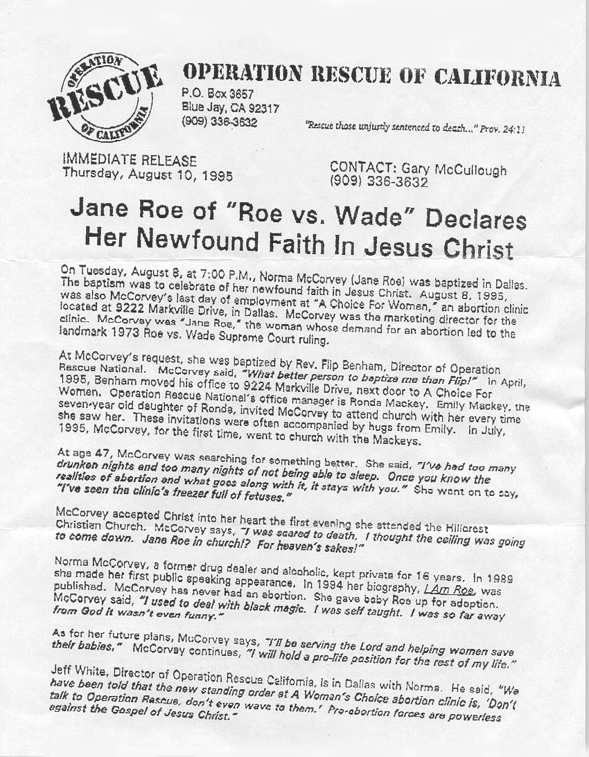 Press Release on Conversion of Norma McCorvey